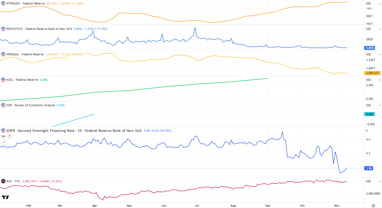 Basically, liquidity has been sucked out of the system through the Fed's QT program and the government shutdown. That liquidity will eventually be released back into the system, especially with the government reopening and the Fed ending QT at the end of November. I could be missing something, and I'm certainly not an expert, so take this for what it's worth, but in my view, liquidity is the single most important macro factor that drives share prices in the short term. Right now, liquidity is tight, which helps explain why the market environment has been challenging. However, I think the Fed could soon release a significant amount of cash into the system.