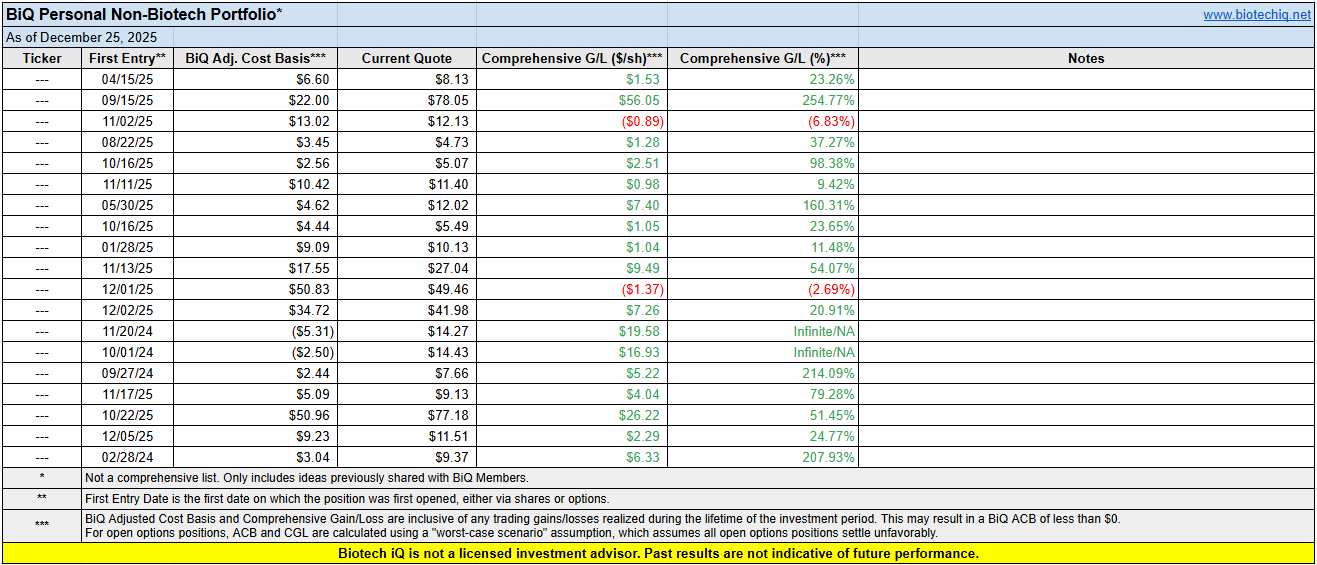 And finally, here's a recap of the non-biotech positions which I have shared with BiQ members in chat. While these are not the focus of Biotech iQ, I have started to share some of my non-biotech picks with members as many members have expressed interest about my non-bio holdings. Please note that non-bio ideas are mostly shared only in the BiQ Chat forum.