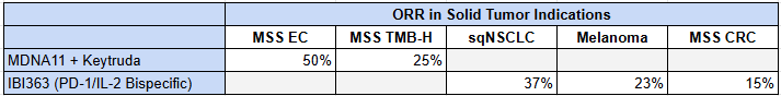 The closest comparator I can find for MDNA11+Keytruda is Innovent's IBI363, which is a PD-1/IL-2 bispecific. Thus, I think the comparison is still somewhat meaningful.