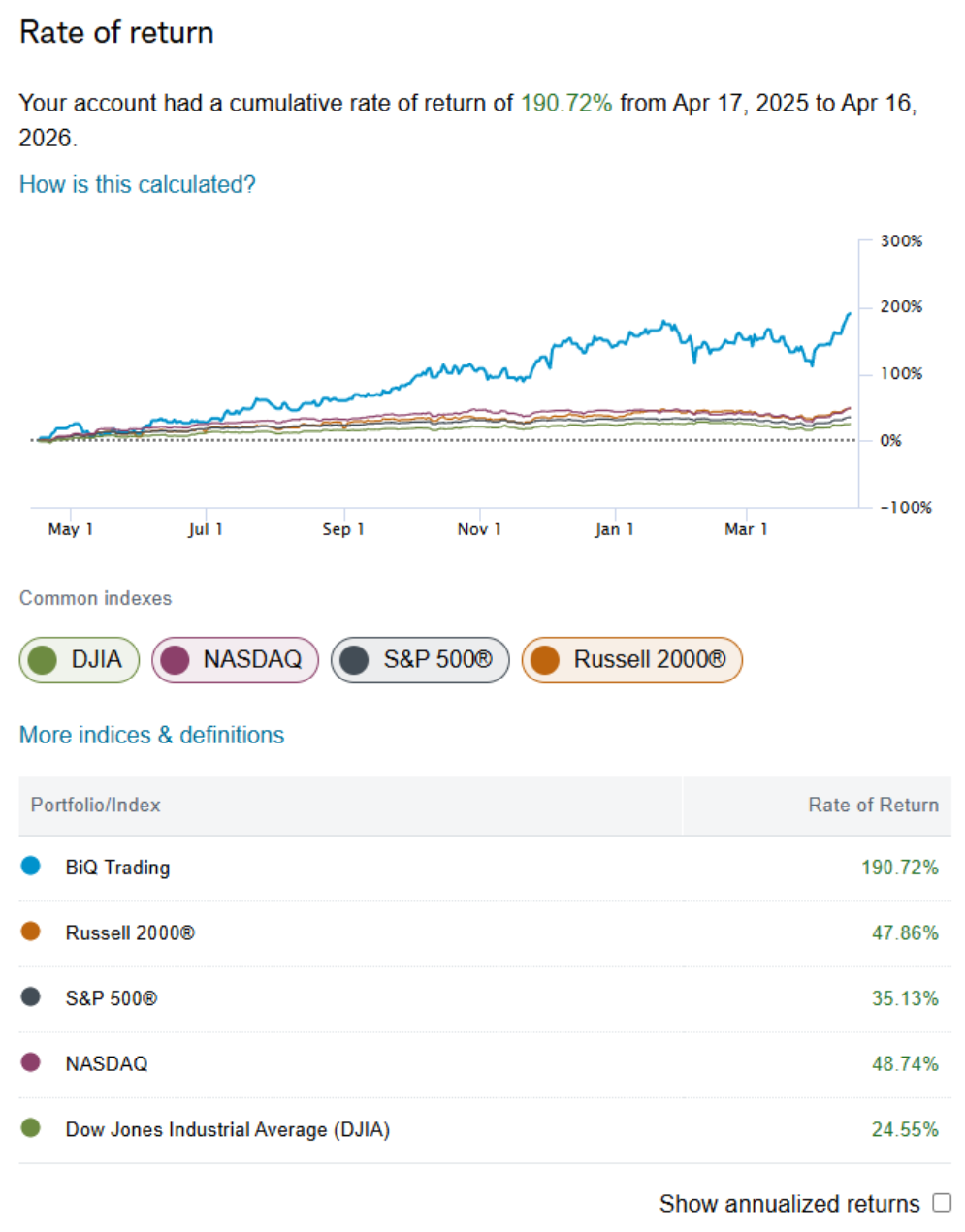 The markets had quite a week, with the major indexes hitting all-time highs on hopes for an Iran peace deal. However, per my article published on April 10th (here), I remain highly skeptical of a peace deal--but I would be happy to be wrong on this one. Either way, this past week was a nice breather. Like the indexes, my personal BiQ portfolio also hit an all-time high, clocking in at a 12-month return of just over 190%. Obviously, the last 5 trading days helped: