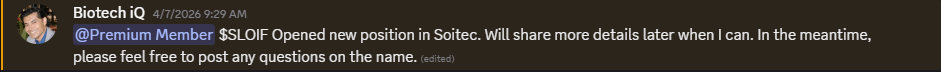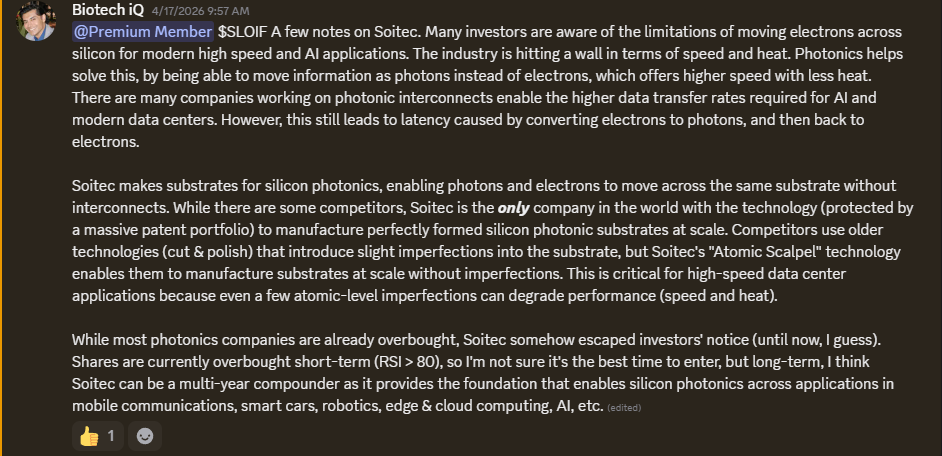 But it wasn't all about war and peace. As one example, I shared a significant new position in Soitec (US ticker SLOIF) with BiQ members via BiQ Chat on April 7th: