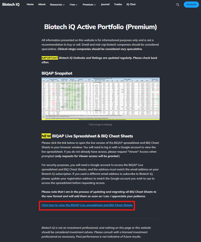To access the new Live BiQAP spreadsheet, go to the Active Portfolio page of the website and click the link near the bottom of the page: