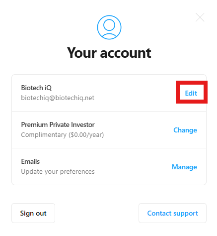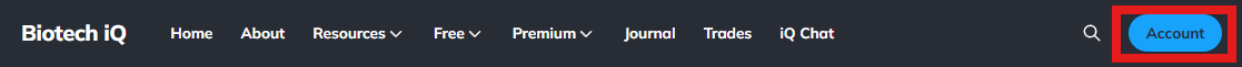 In order to gain access, Premium Members will first need to have a Gmail account and make sure that the Gmail account is the same email address linked to their Biotech iQ subscription. To check the email address linked to your Biotech iQ subscription, click the blue Account button at the top of the Biotech iQ website: