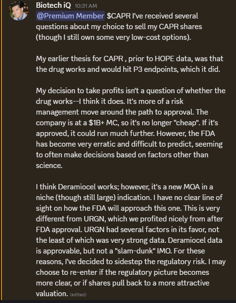 I've had several questions from members after I disclosed in BiQ Premium Chat that I had existed the bulk of my CAPR position after P3 HOPE data was released. Since I know many members have been following this one, I'm sharing my thoughts here for members who don't have access to the Premium Chat forum.