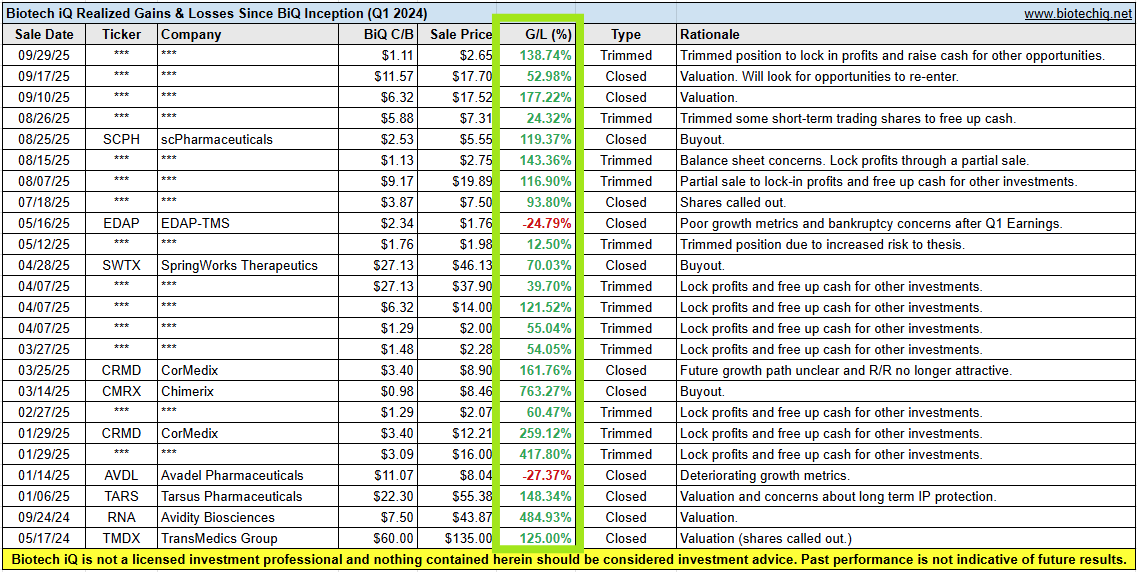 Below is a snapshot of the BiQ Past Performance spreadsheet, including some recently trimmed positions.