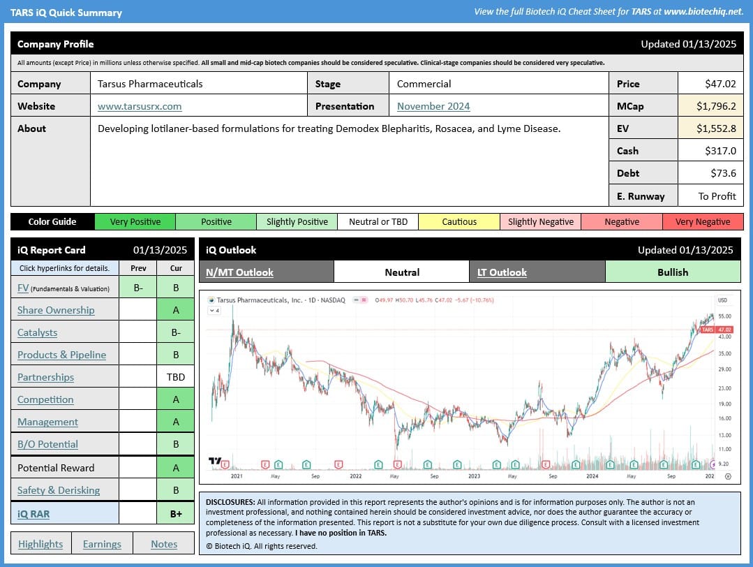 The Near/Mid Term Outlook for Tarsus Pharmaceuticals (TARS) has been upgraded from Cautious to Neutral due to the recent pullback in the share price, resulting in a more favorable valuation.